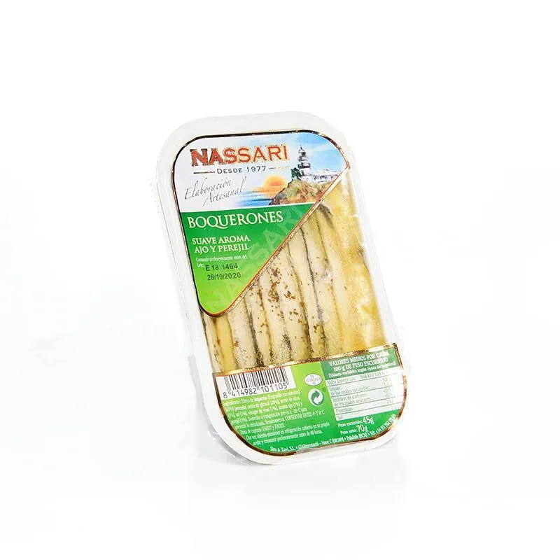 Los boquerones en vinagre Nassari es una de las tapas o aperitivos más tradicionales de la gastronomía española. Su principal ingrediente es el boquerón, un pez de pequeñas dimensiones cuyos lomos han sido previamente marinados en vinagre, ajo y perejil.