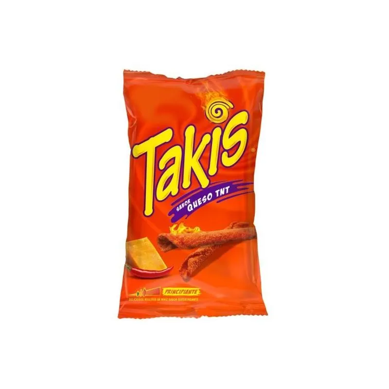 Los takis son unos snacks de origen en México, se caracterizan por las especias que utilizan para elaborarlo. En Europa son nos snacks que se elaboran solo en España. Los takis se podrían definir como unas patatas enrolladas y especiadas muy picantes. Los takis son los snacks del momento. Te ofrecemos los Takis hot, también llamados como takis fuego.