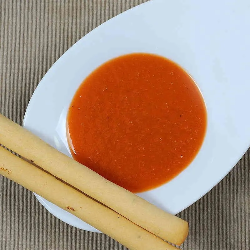 El Gazpacho probablemente es uno de los platos más conocidos de la gastronomía Española. Aquí viene en su versión clásica, 100% natural y con el sabor típico y rico que lo hace tan popular.