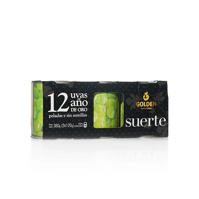Las Uvas Golden son las 12 uvas que necesitamos para pasar una nochevieja perfecta, como sigue la tradición. Esta tradición de origen español consiste en comerse doce uvas, una por cada campanada, a las 12 de la noche el día 31 de diciembre. Supuestamente trae buena suerte para el año nuevo.
