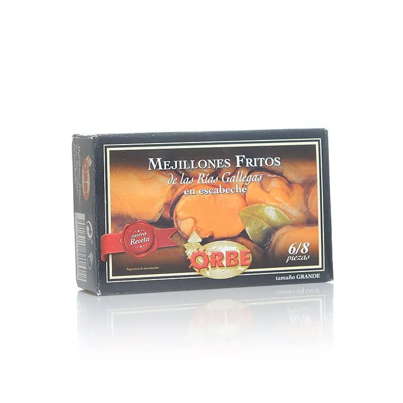 Nuestros mejillones en escabeche de las Rías Gallegas de la marca Orbe vienen sin concha, en lata de conserva y marinados en una deliciosa salsa escabeche. Un producto ideal para sorprender a cualquier paladar.