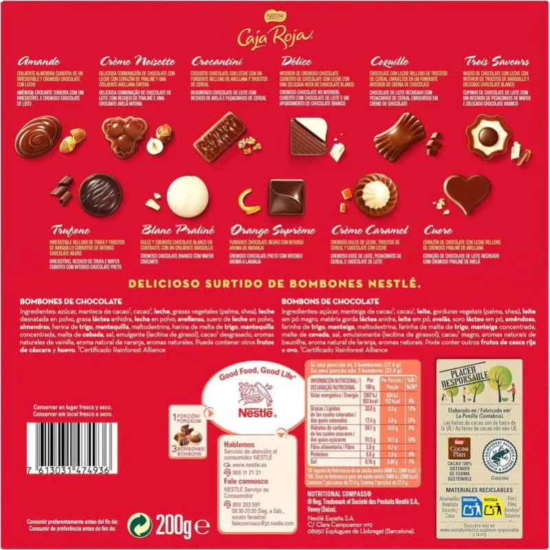 Disfruta de un surtido de bombones de lo más delicioso de mano de Caja Roja Nestlé. Un autentico placer para los sentidos. Un surtido de 22 bombones para tu disfrute. El variado surtido trae delicados sabores donde el maravilloso chocolate es el protagonista.