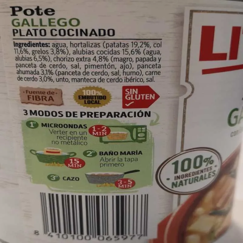 Agua, hortalizas (patata 19,2%, col 11,6%, grelos 3.8%), alubias cocidas 15.6% (agua, alubias 6.5%), chorizo extra 4.8% (magro, papada y panceta de cerdo, sal, pimentón, ajo), panceta ahumada 3.1% (panceta de cerdo, sal, humo), carne de cerdo 3.0%, unto, manteca de cerdo ibérico y sal.