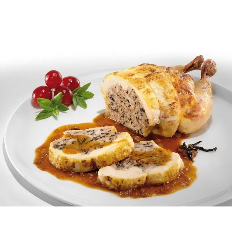 Pularda semi-deshuesada tratada en salazón 60%, relleno 40% (carne de cerdo, grasa de cerdo, vino de Oporto modificado, trompetas de la muerta rehidratadas 1.7%, agua, champiñones, trozos de trufa de verano 0.8%, chalota y sal.
