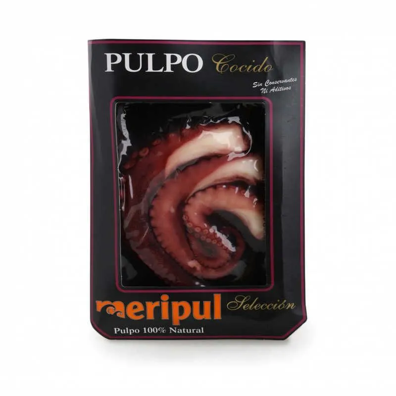 El pulpo es uno de los productos estrella de la gastronomía gallega. Un invertebrado que se cocina de manera muy sencilla, un alimento muy apreciado por todos. Te presentamos unos tentáculos de pulpo cocido envasados al vacío. Este producto viene conservado en un gel que prolonga la vida. Si quiere comerlo al estilo de Galicia, lo ideal es cortarlo con una tijera y añadir patata cocida y un poco de aceite de oliva virgen extra y pimentón dulce.