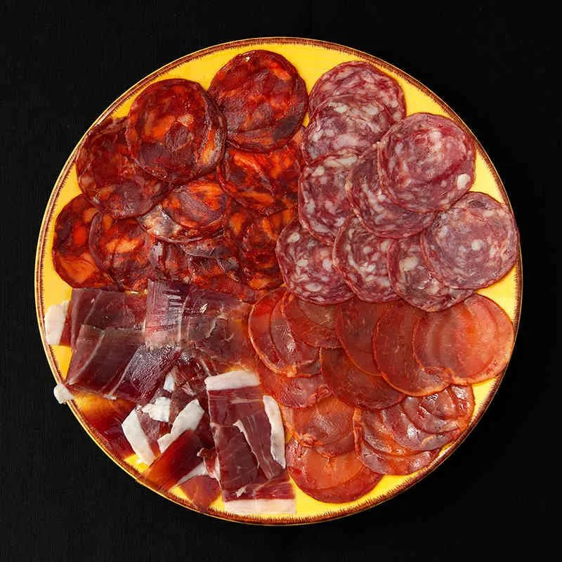 Es surtido de ibéricos es un pack que está formado por jamón ibérico, chorizo ibérico, salchichón ibérico y lomo ibérico. Provienen de cerdos ibéricos con 50% raza ibérica, de la Denominación de Origen Guijuelo. Tanto el jamón como el lomo están certificados por una empresa externa.