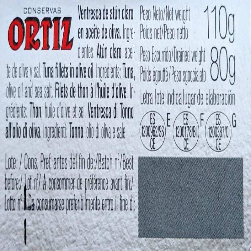 Manufacturado en Conservas Ortiz, S.A. – Iñaki Deuna 15, 48700 Ondárroa, Vizcaya